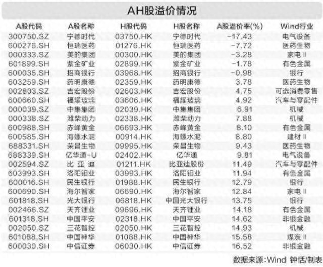 截至9月5日收盘,161只A+H股中,H股价格超过A股的有5只,包括宁德时代、恒瑞医药、美的集团、紫金矿业和招商银行,其中宁德时代价格倒挂幅度最大,达到17.43%。
